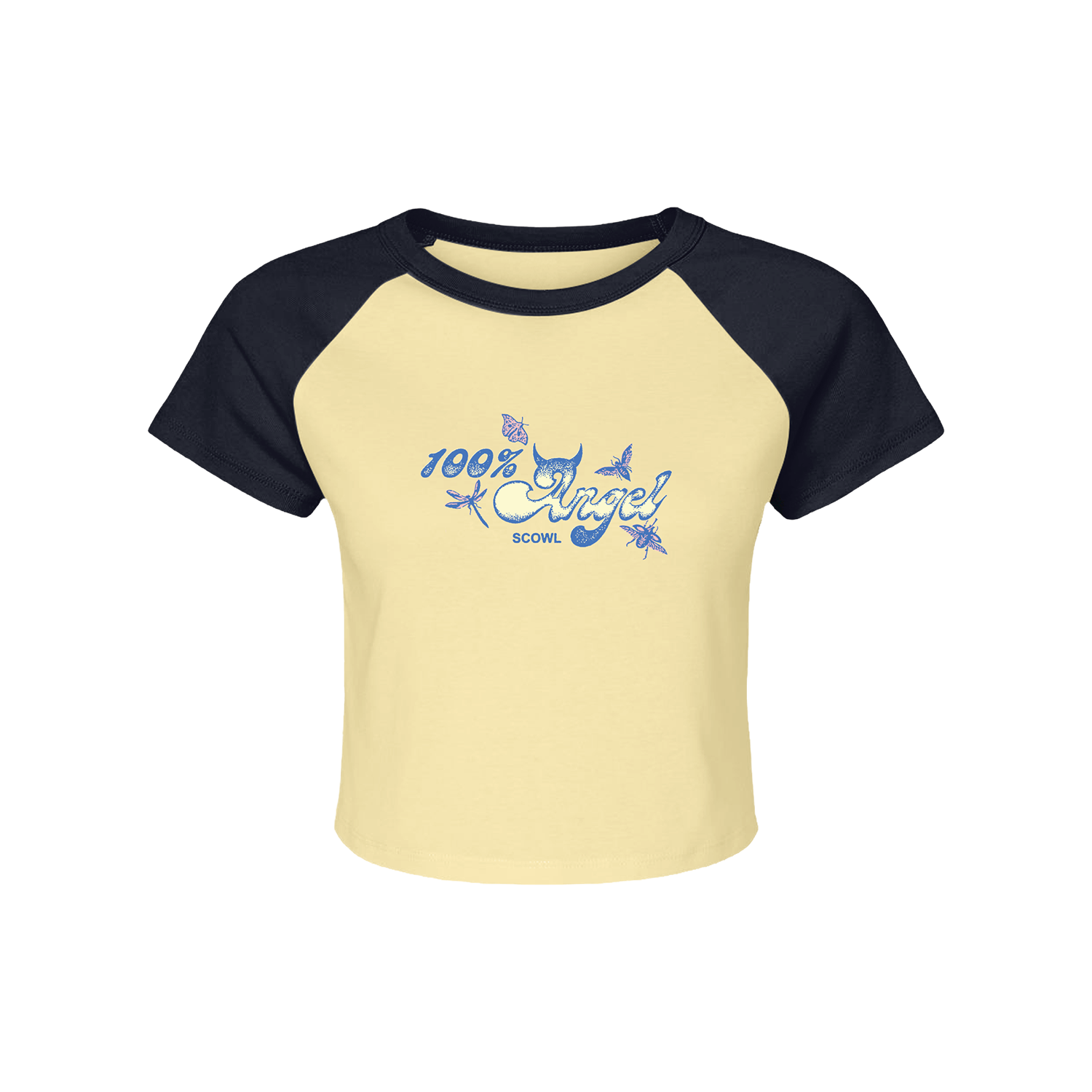 Official Scowl Merchandise. Screen printed on a baby yellow 100% Cotton classic girl t-shirt.